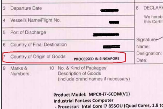 - COO (Certificate of Origin) issued from SMA (Singapore Manufacturing Federation), our company may apply COO as “Processed in Singapore” as below, because all final parts assembly & QC testing are conducted in our Singapore workshop, please let us know if you need it which is upon request to apply.